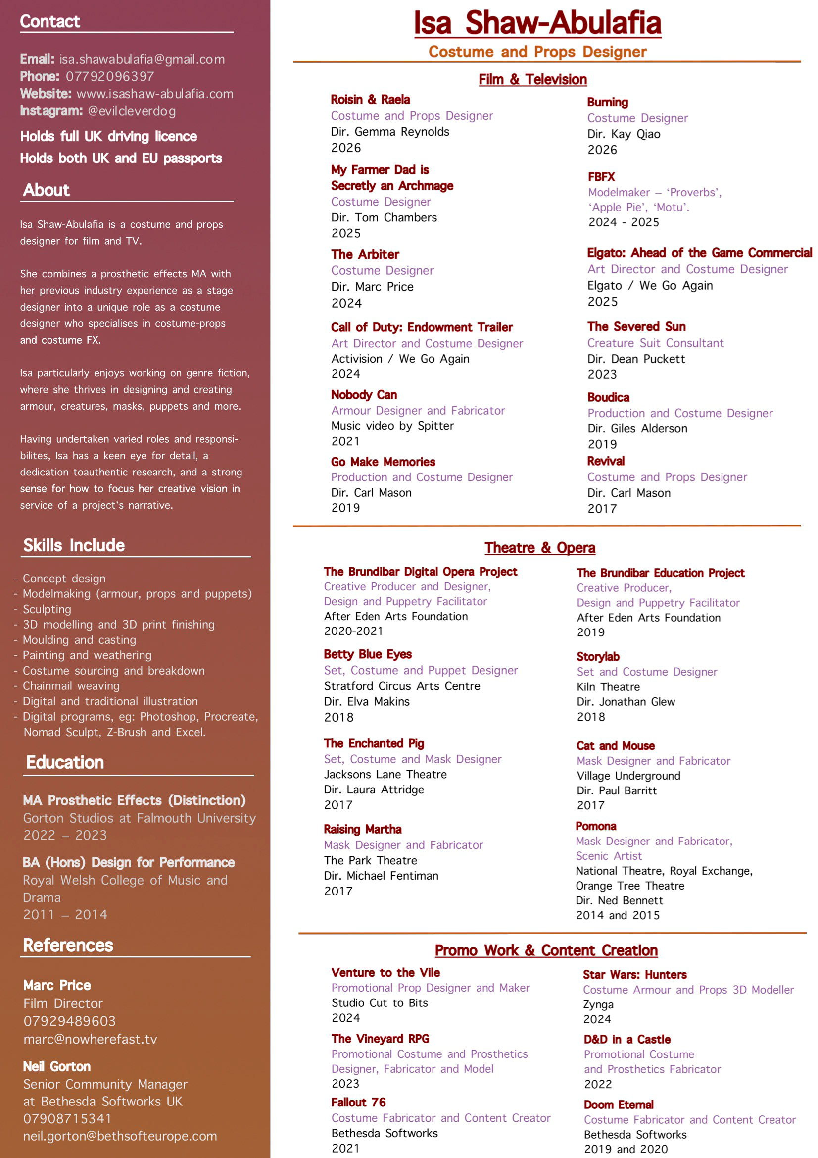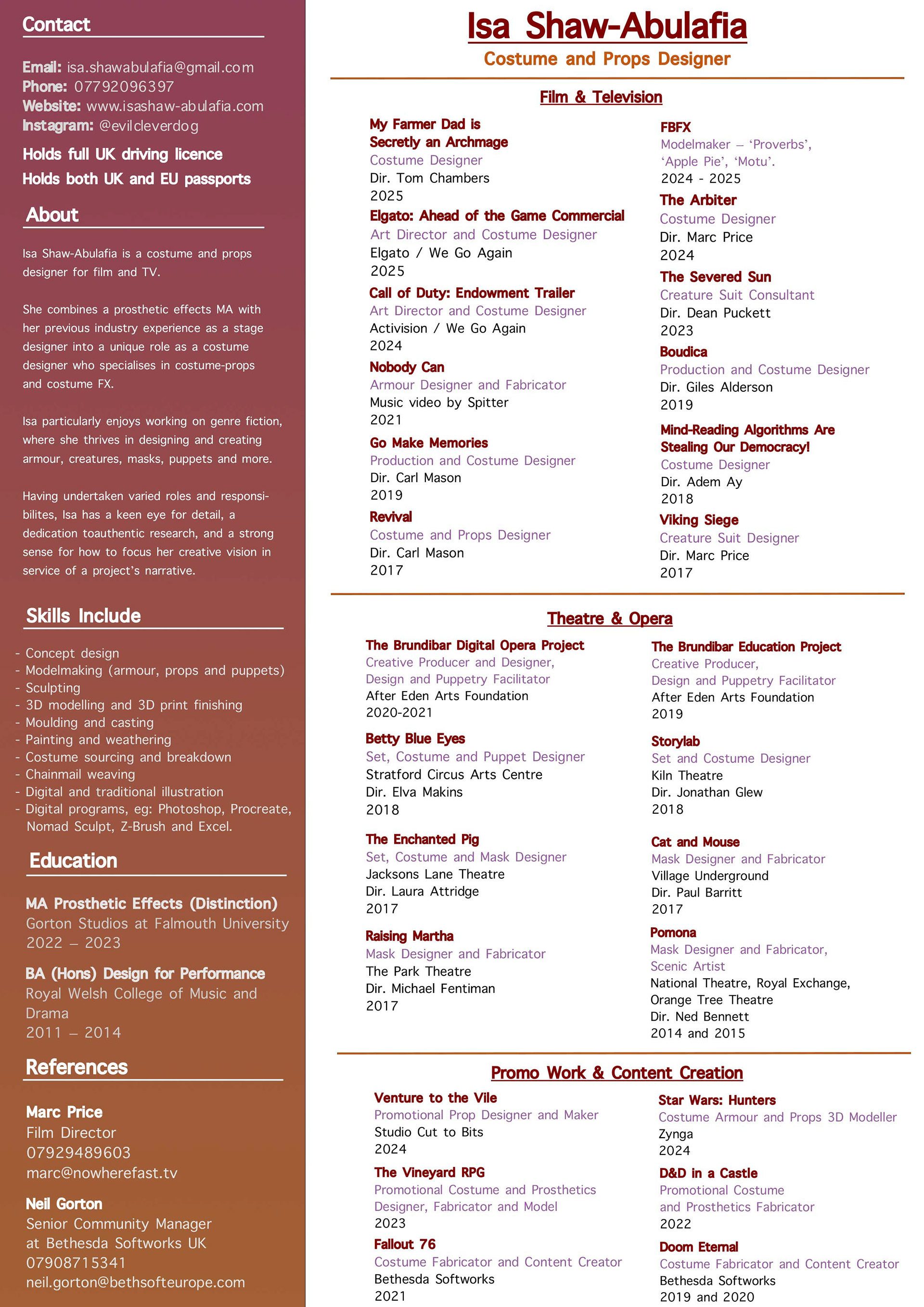 Isa Shaw-Abulafia is a UK-based costume and props designer and modelmaker for film and TV. She began her career working in theatre and indie film, taking on a variety of creative roles. This included both designing and making sets, costumes, props, masks, and puppets. She also creates promotional costumes and props for commercial clients, for both live events and online content. She combines a prosthetic effects MA with her previous industry experience as a stage designer into a unique role as a costume designer who specialises in costume-props and costume FX. Throughout her varied career, she has acquired a wide range of creative skills in design and fabrication, as well as a strong ability to adapt to each individual project’s needs and challenges. View Isa's CV below: