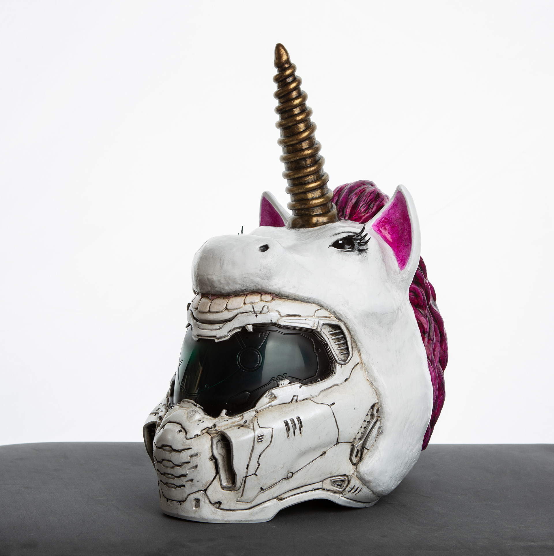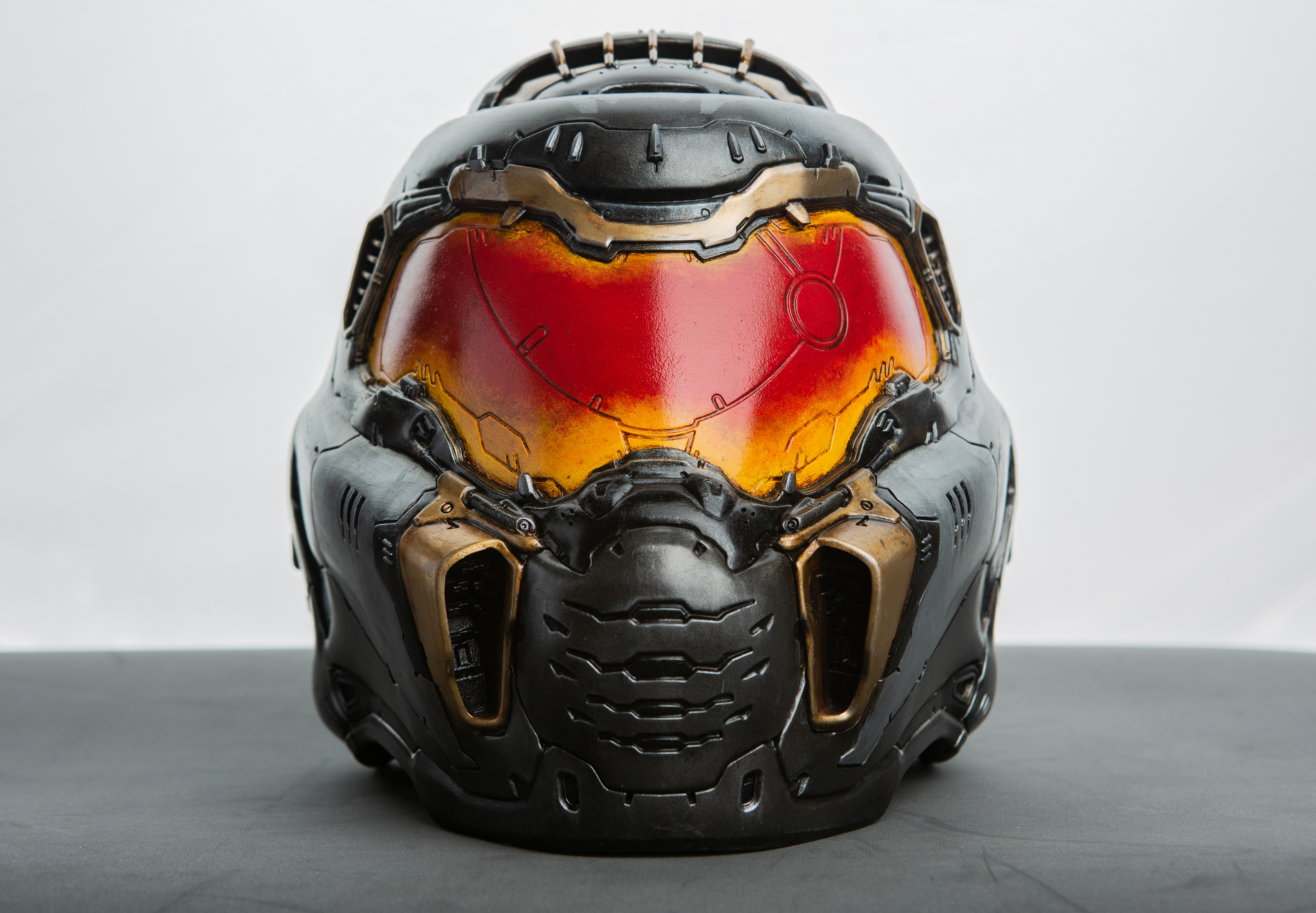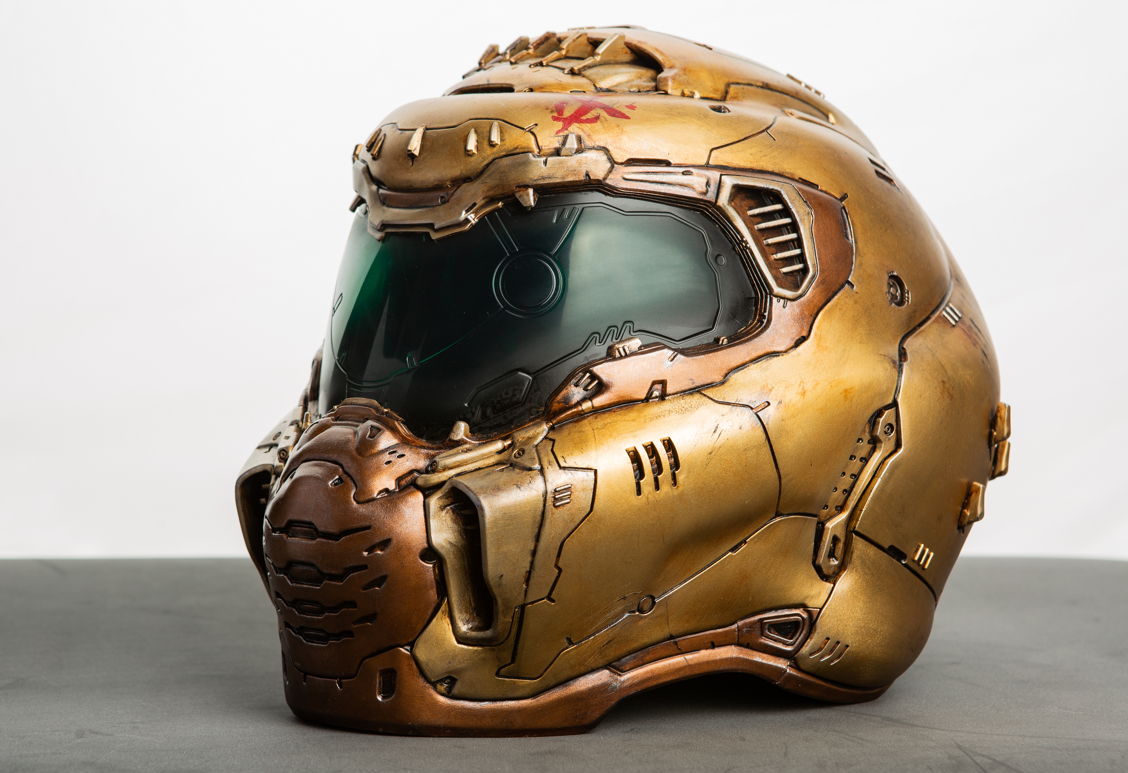 Doomslayer costume and customised collectors edition helmets created in collaboration with Bethesda UK, to promote the release of 'Doom Eternal' (2019) and 'Doom Eternal: The Ancient Gods' (2020). Costume model: Matt Symonds. Costume photographer: Shuhel Ali. Helmets photographer: Robert Gershinson.